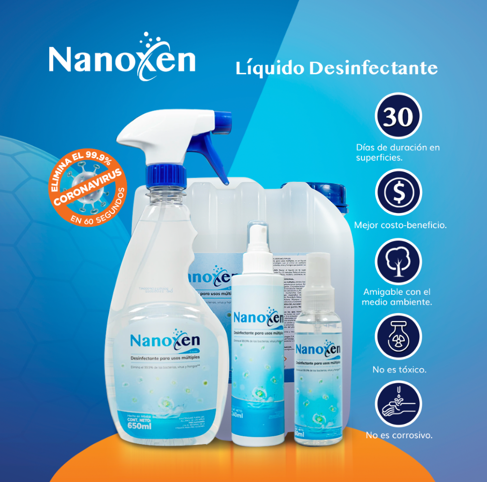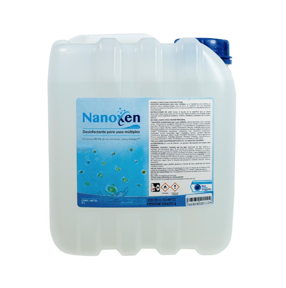 LÍQUIDO DESINFECTANTE NANOXEN 4 L (1 pieza) Nanoxen es un innovador producto nanotecnológico de amplio espectro que elimina e inhibe bacterias, virus y hongos dañinos para el ser humano.